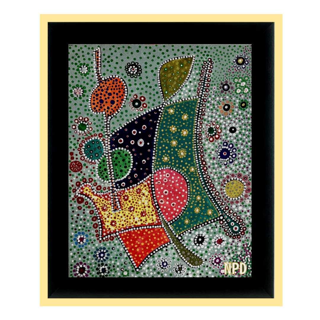 A solitary figure steps into the hush of night, lantern aloft, attire immaculate. Each dot of pigment pulses with rhythm, echoing a private choreography that blurs the line between grace and madness. Inspired by the aphorism, “Those who were seen dancing were thought to be insane by those who could not hear the music,” this work invites the viewer to witness the beauty of defiant joy—where refinement meets rebellion in a flicker of light.