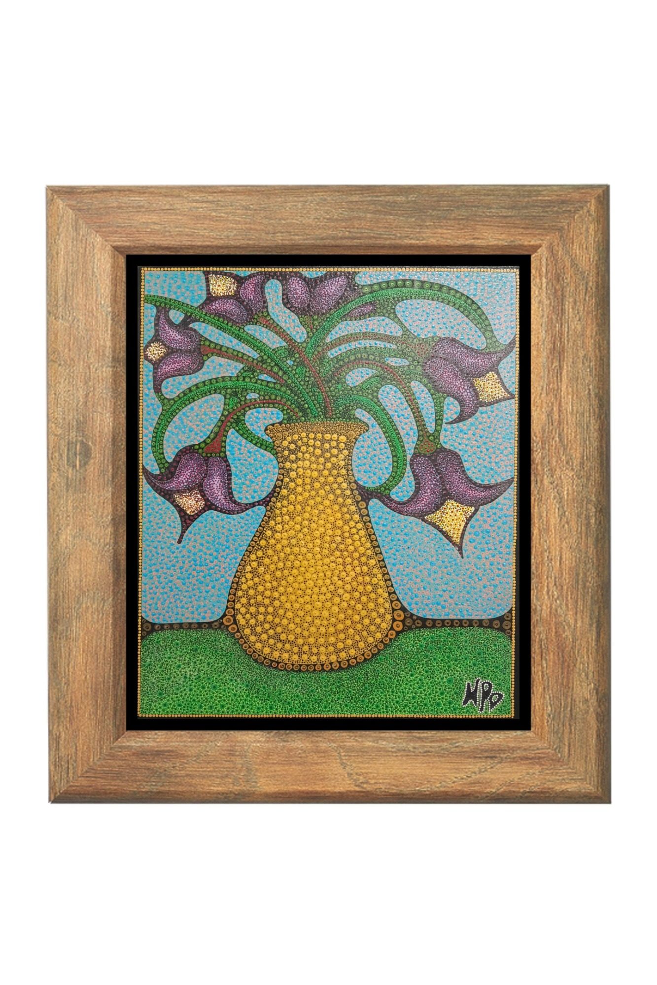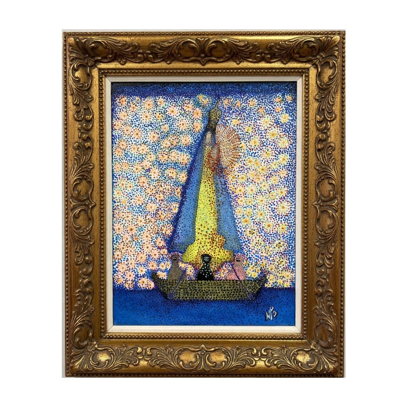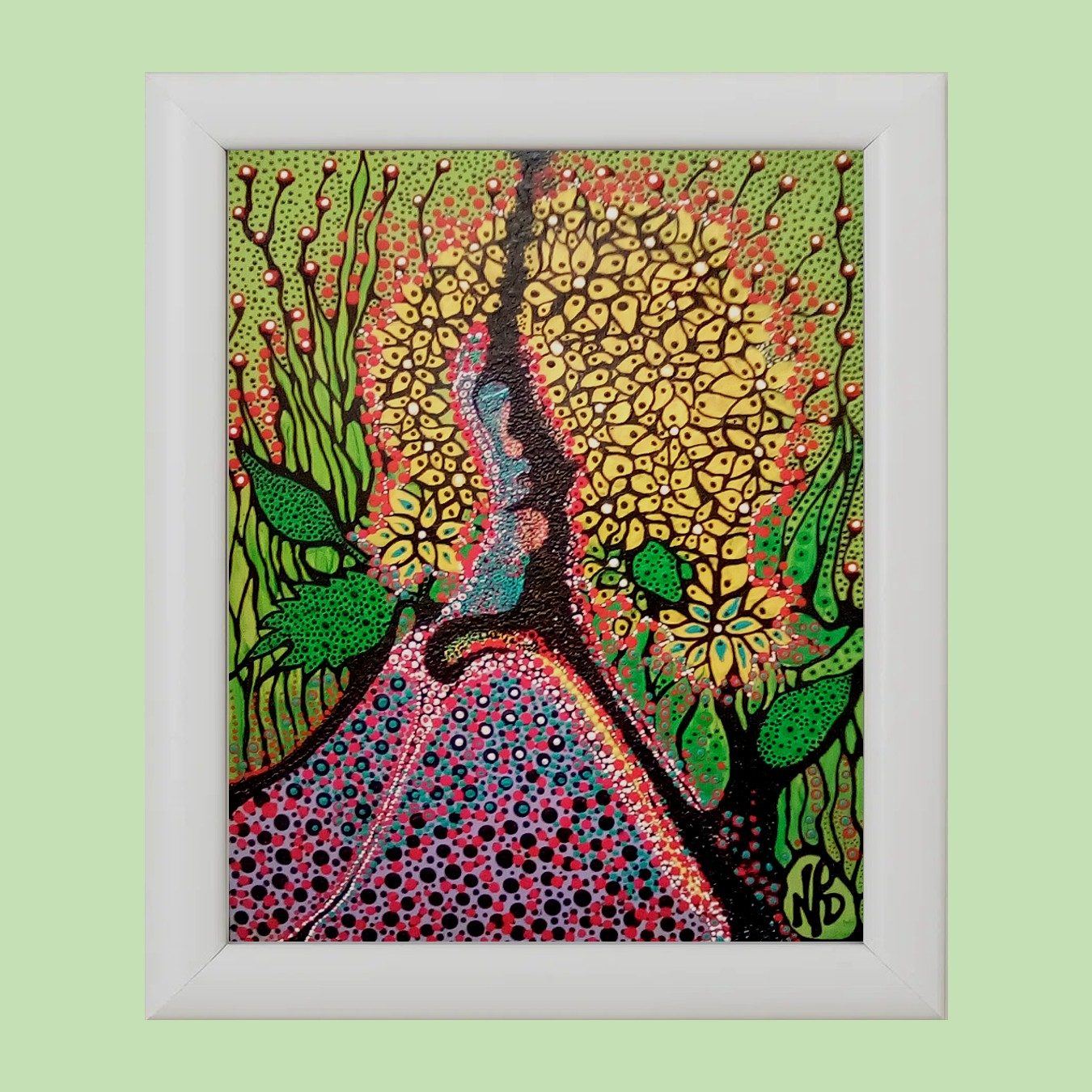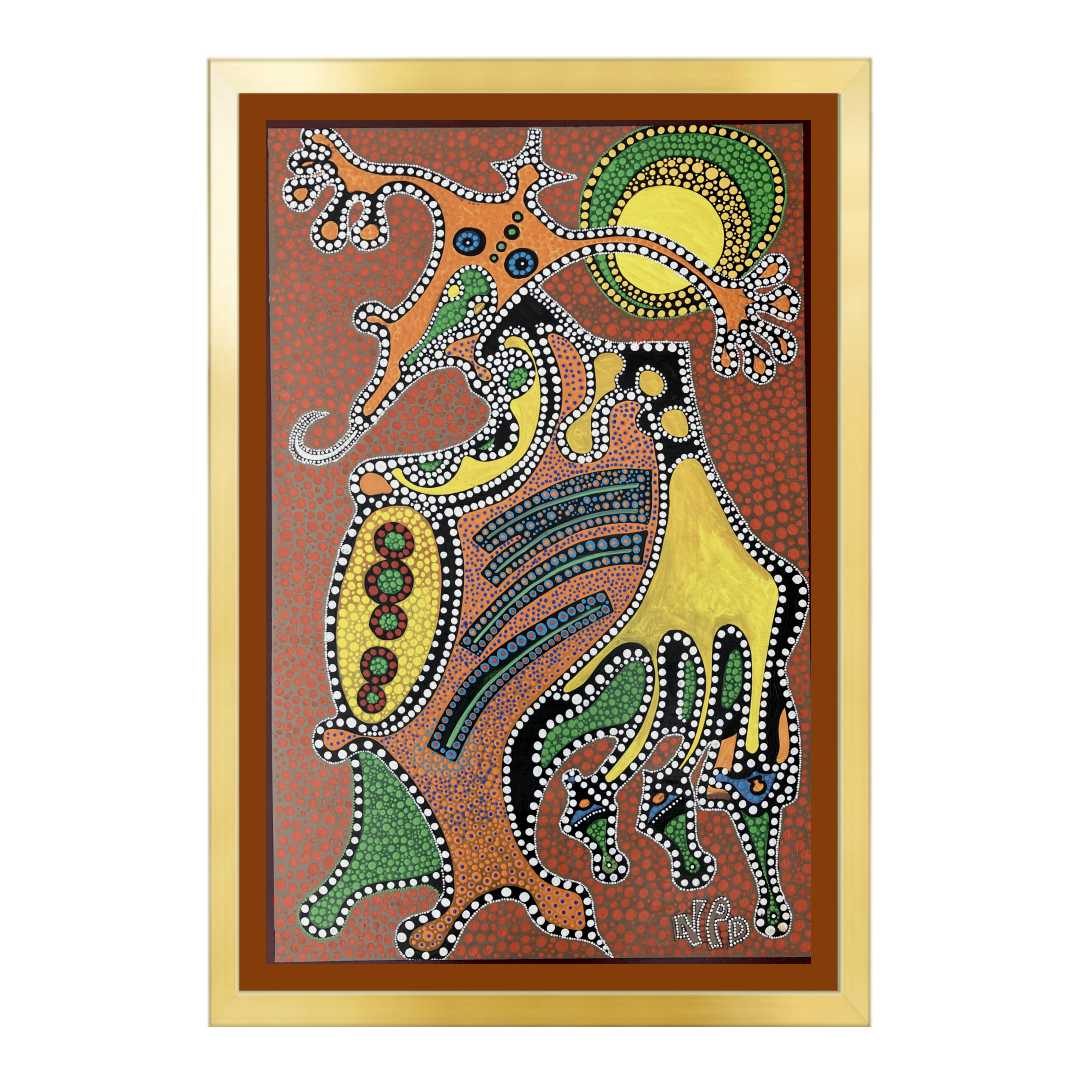 The primitive pointillism technique breathes life into the scene through countless tiny dots of pigment, creating a textured, almost mosaic-like effect that invites the viewer to contemplate each detail closely. This stylistic choice evokes a timeless, almost mystical aura, bridging the ancient and the modern, the earthly and the divine.