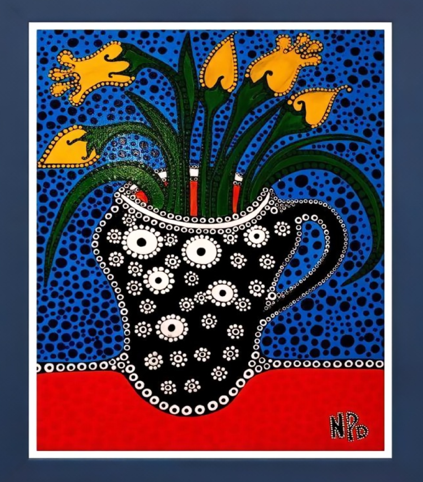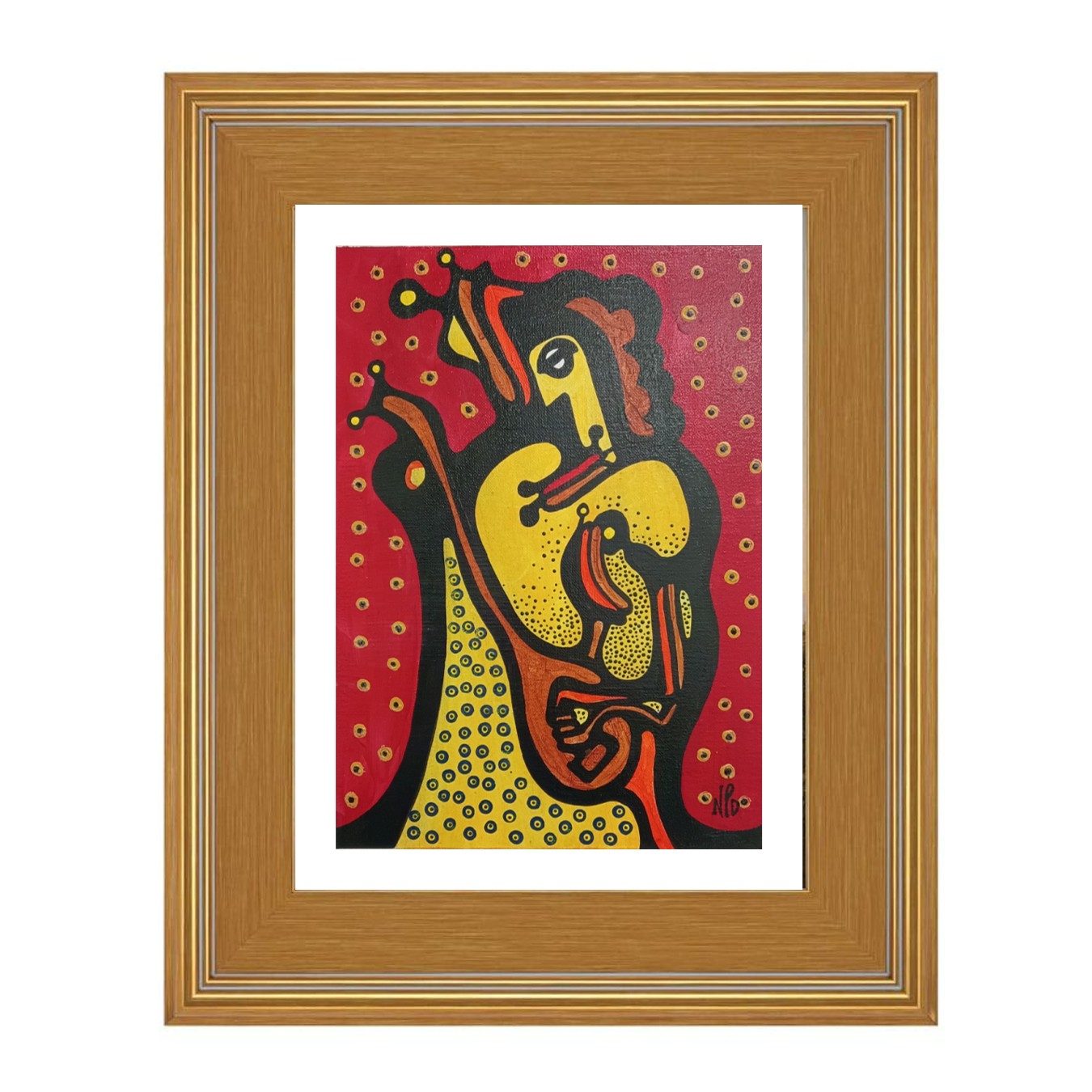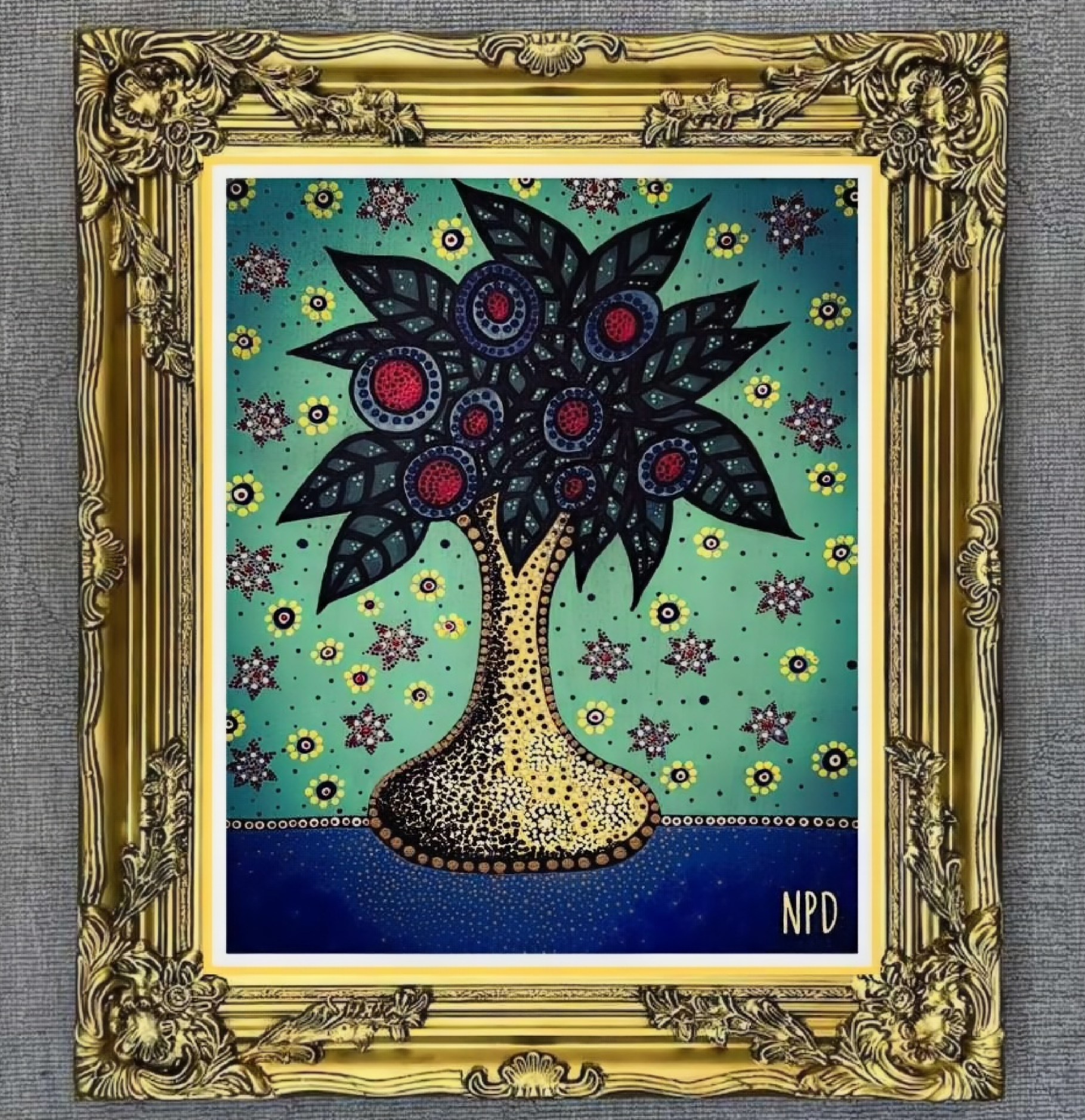 The primitive pointillism technique breathes life into the scene through countless tiny dots of pigment, creating a textured, almost mosaic-like effect that invites the viewer to contemplate each detail closely. This stylistic choice evokes a timeless, almost mystical aura, bridging the ancient and the modern, the earthly and the divine.