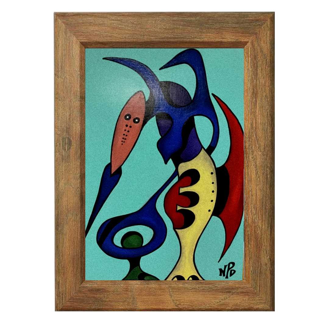 For centuries, chickens have captivated painters with their character and symbolism. Ele Gallo is my own interpretation—a solitary, expressive rooster created on a 20×24 sheet of recycled brown kraft cardstock and presented in a frame crafted from reclaimed glass and synthetic wood. A humble subject, reborn through reclaimed materials.
