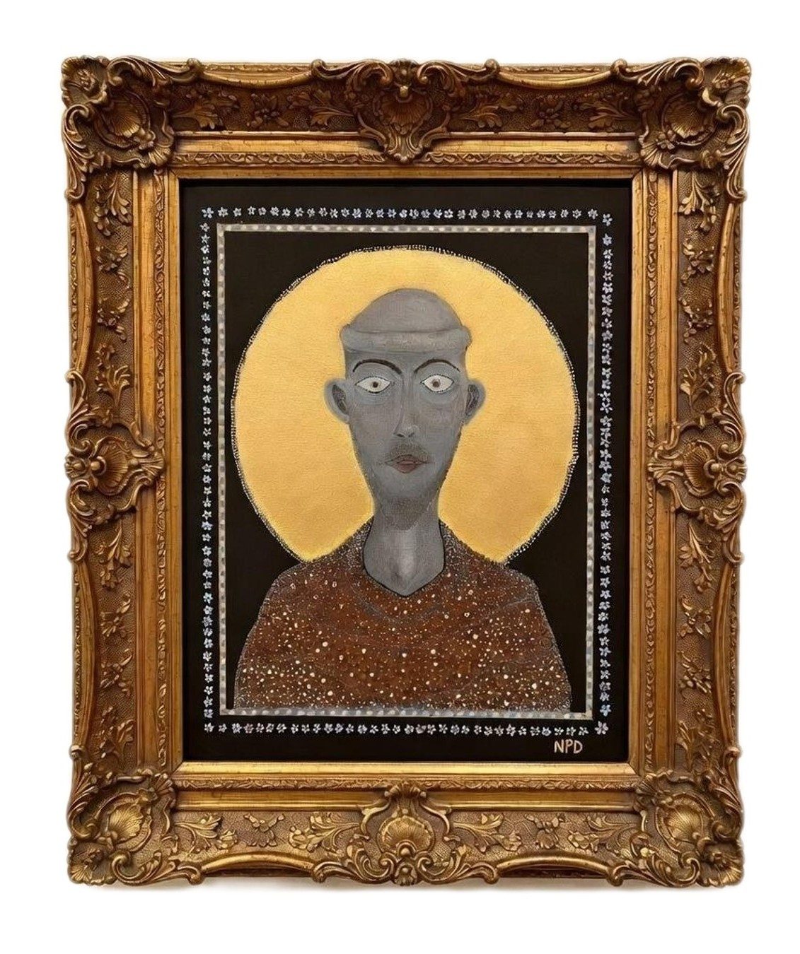 The choice of gray skin tones reflects St. Francis’s profound embrace of poverty and renunciation, stripping away earthly vanity to reveal the spiritual essence beneath. His expression is serene yet deeply human, inviting viewers to contemplate the virtues of humility, compassion, and connection to the natural world.