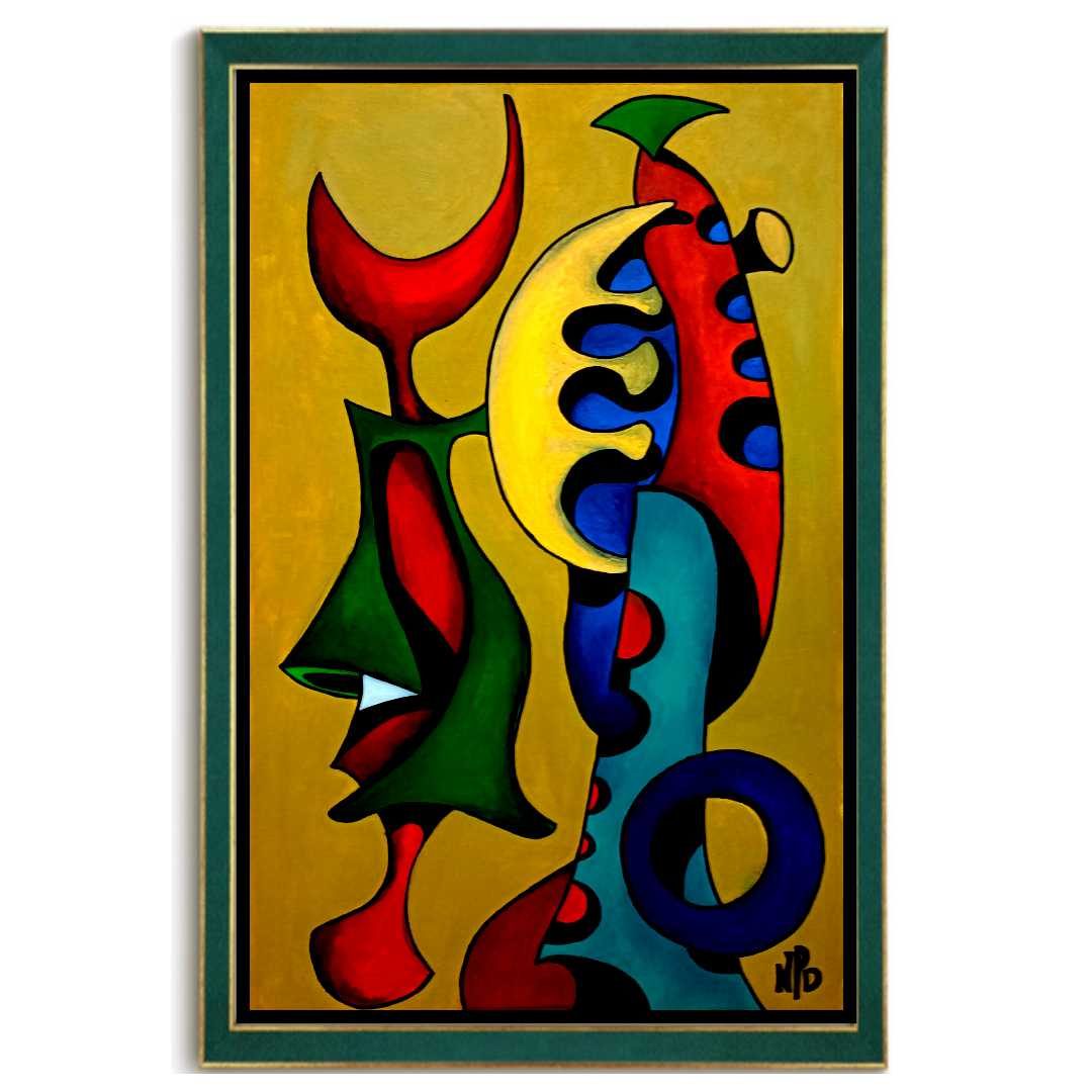 This abstract canvas draws inspiration from the iconic instrumental mambo and jazz dance composition "Mambo Number 5," originally composed and recorded by Cuban musician Dámaso Pérez Prado in 1949. The piece captures the essence of a woman immersed in music, depicted through the stylized form of a figure playing a stringed instrument reminiscent of a guitar.