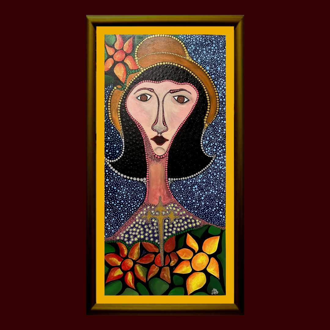 In this evocative piece rendered in a primitive pointillism style, Saint Barbara is portrayed with profound symbolism and serene dignity. She stands framed by an arched window, a portal that connects the sacred interior with the vibrant world beyond. Surrounding her are delicate bay flowers, their soft petals and leaves rendered with meticulous dots of color, creating a natural halo that enhances her sanctity and grace.
