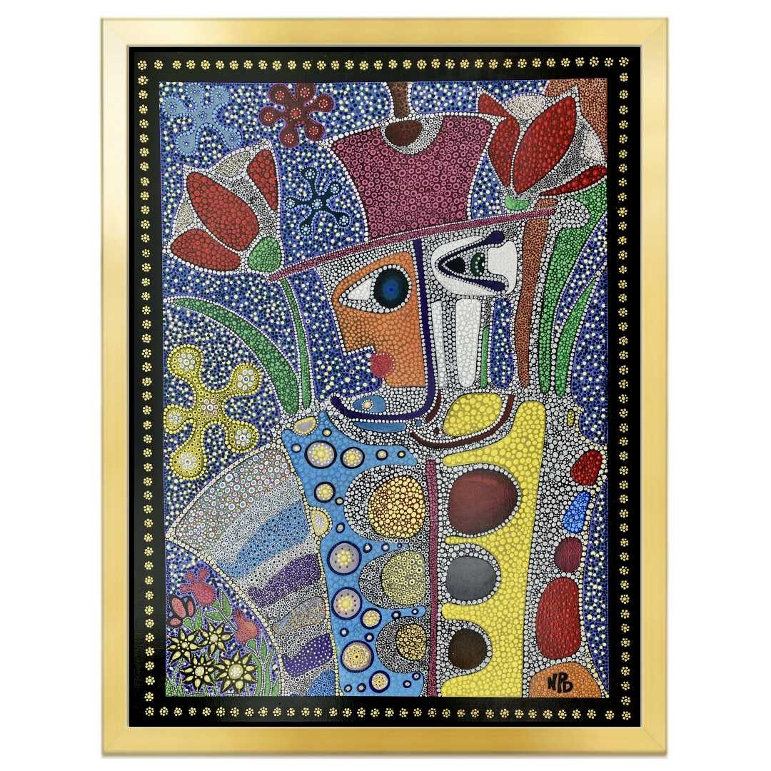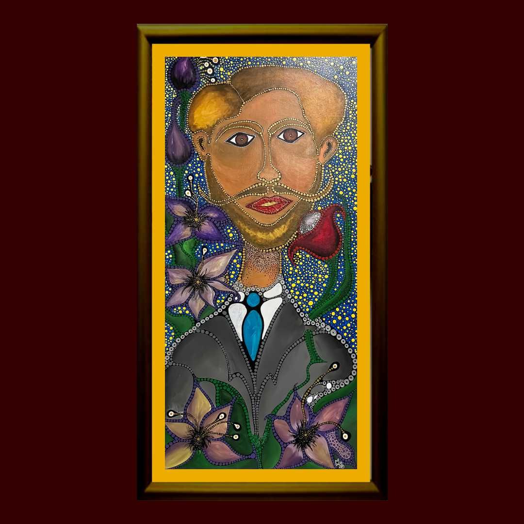 A solitary figure steps into the hush of night, lantern aloft, attire immaculate. Each dot of pigment pulses with rhythm, echoing a private choreography that blurs the line between grace and madness. Inspired by the aphorism, “Those who were seen dancing were thought to be insane by those who could not hear the music,” this work invites the viewer to witness the beauty of defiant joy—where refinement meets rebellion in a flicker of light.