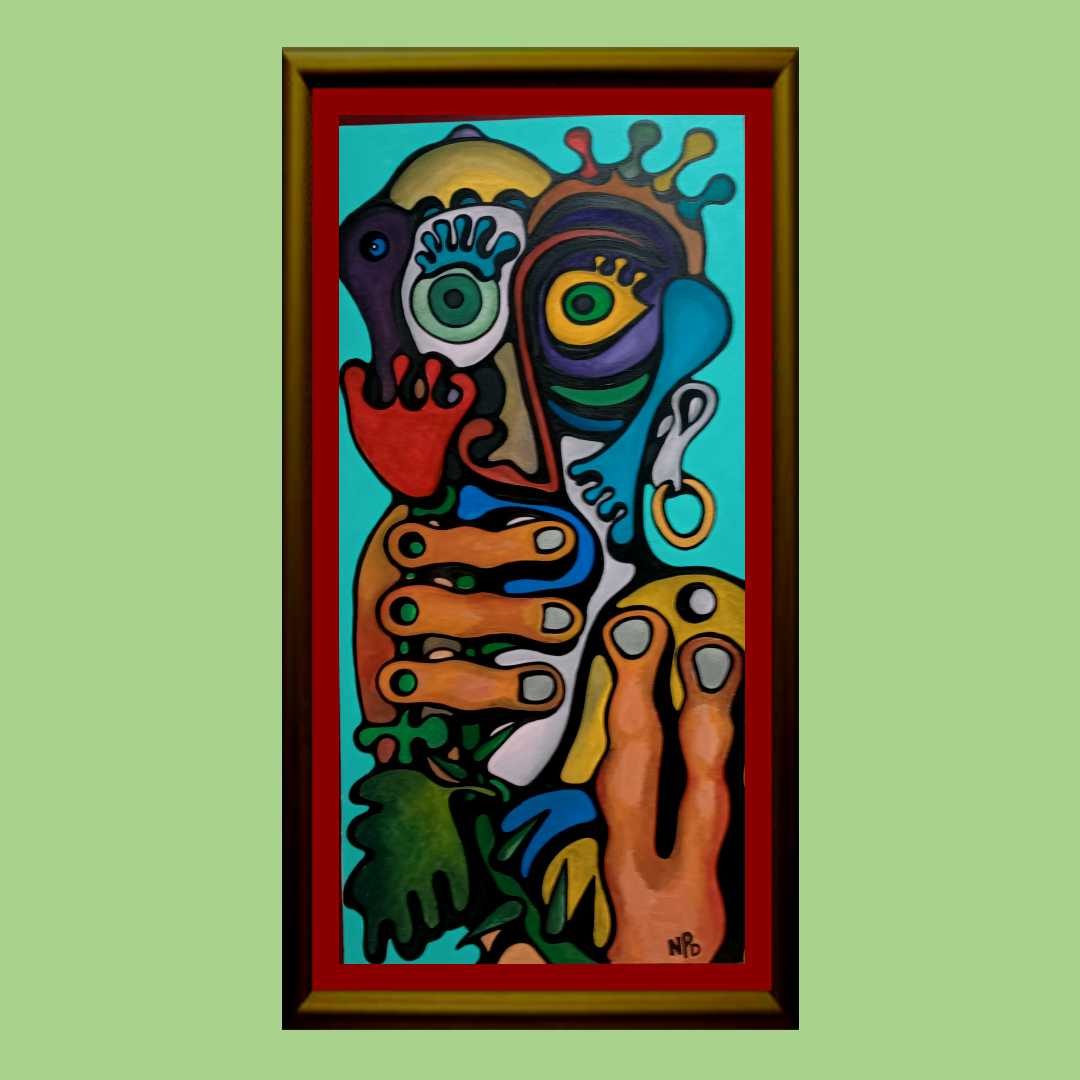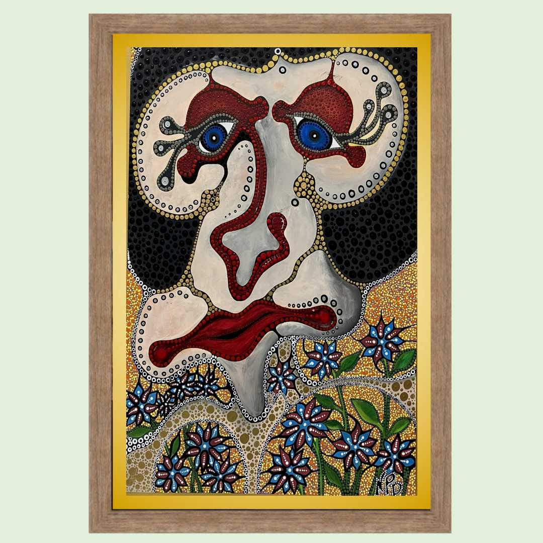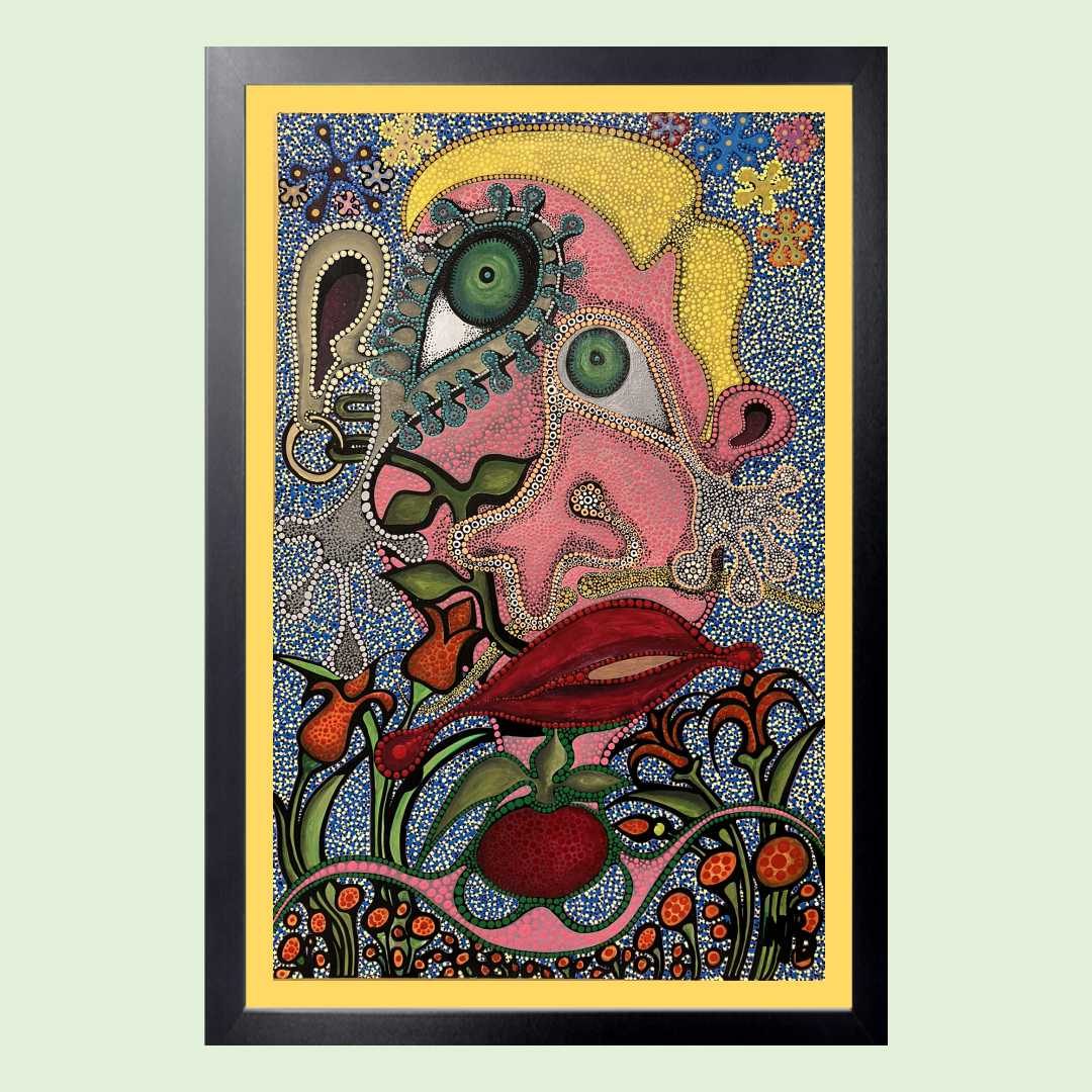 Rendered in acrylic on a 24×36 inch canvas, this piece is a parody layered over a carefully composed foundation. The intricate arrangement of dots creates a dynamic tension, balancing form and fragmentation. This playful yet complex pattern invites viewers to reflect on how perspective shapes our understanding of life’s contradictions.
