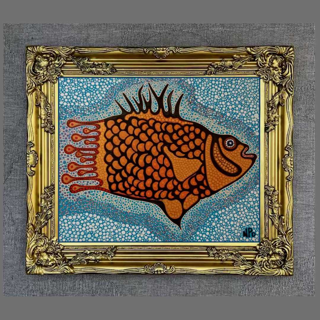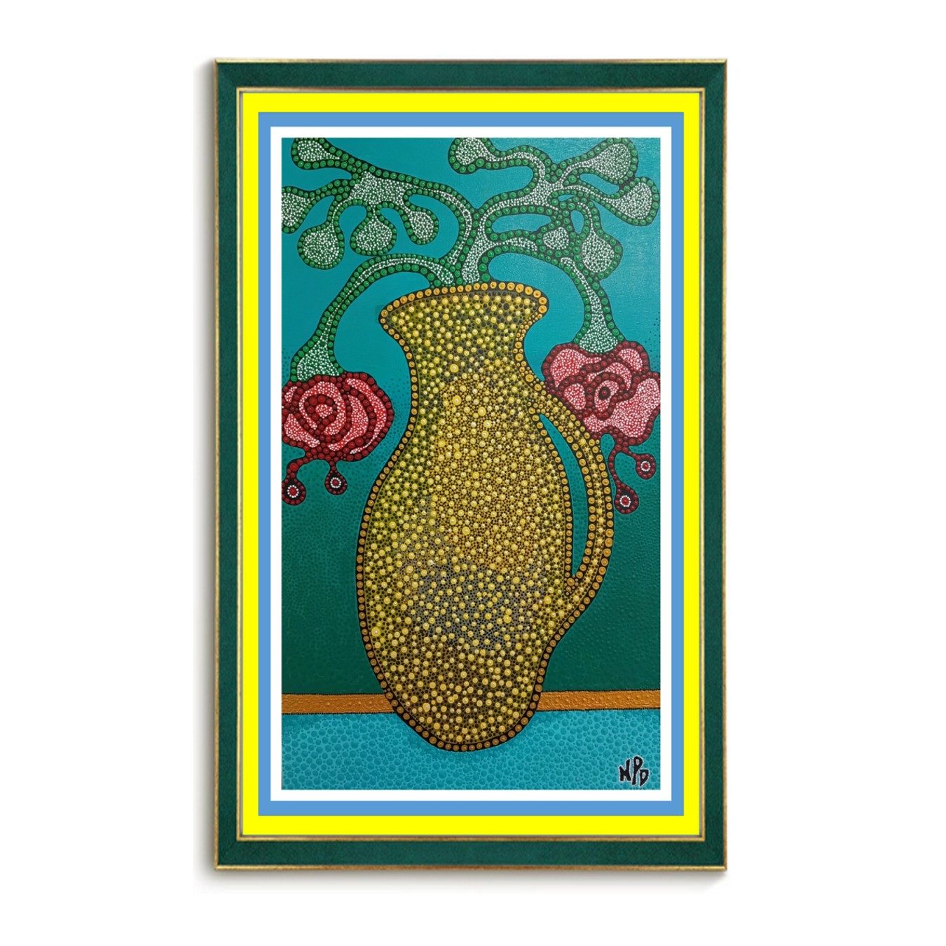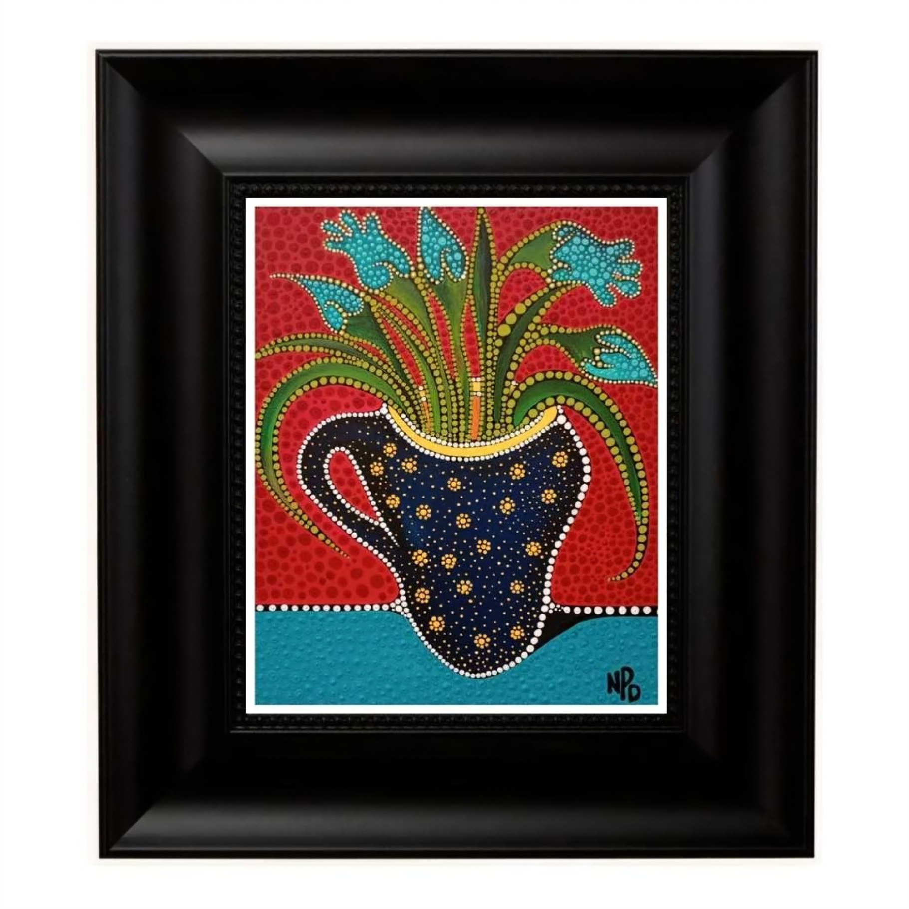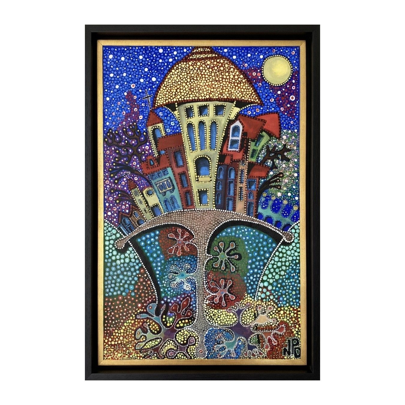 The primitive pointillism technique breathes life into the scene through countless tiny dots of pigment, creating a textured, almost mosaic-like effect that invites the viewer to contemplate each detail closely. This stylistic choice evokes a timeless, almost mystical aura, bridging the ancient and the modern, the earthly and the divine.