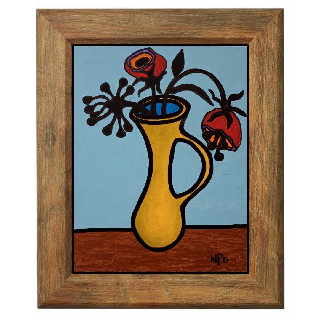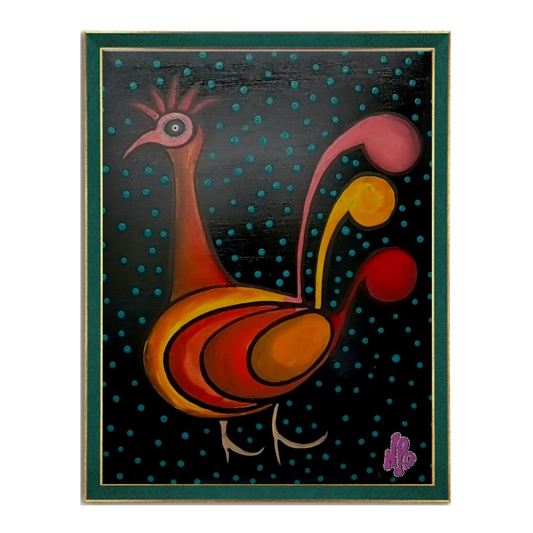 For centuries, chickens have captivated painters with their character and symbolism. Ele Gallo is my own interpretation—a solitary, expressive rooster created on a 20×24 sheet of recycled brown kraft cardstock and presented in a frame crafted from reclaimed glass and synthetic wood. A humble subject, reborn through reclaimed materials.