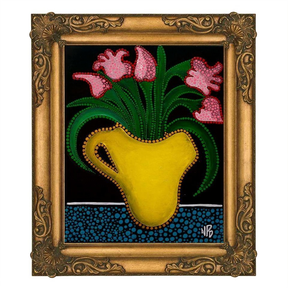 In this evocative piece rendered in a primitive pointillism style, Saint Barbara is portrayed with profound symbolism and serene dignity. She stands framed by an arched window, a portal that connects the sacred interior with the vibrant world beyond. Surrounding her are delicate bay flowers, their soft petals and leaves rendered with meticulous dots of color, creating a natural halo that enhances her sanctity and grace.