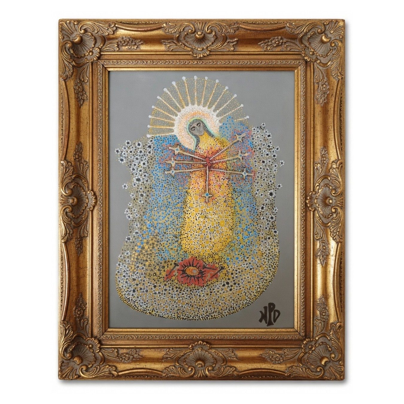 The canvas titled Sorrow presents a profound meditation on the Mater Dolorosa—the Virgin of Sorrows—rendered in a style that merges the raw emotional intensity of Pontillism with the elemental directness of Primitivism. Here, the Virgin Mary is depicted in a moment of unconsolable grief, her gaze cast downward toward the crown of thorns, the nails, and the blood of her crucified son.