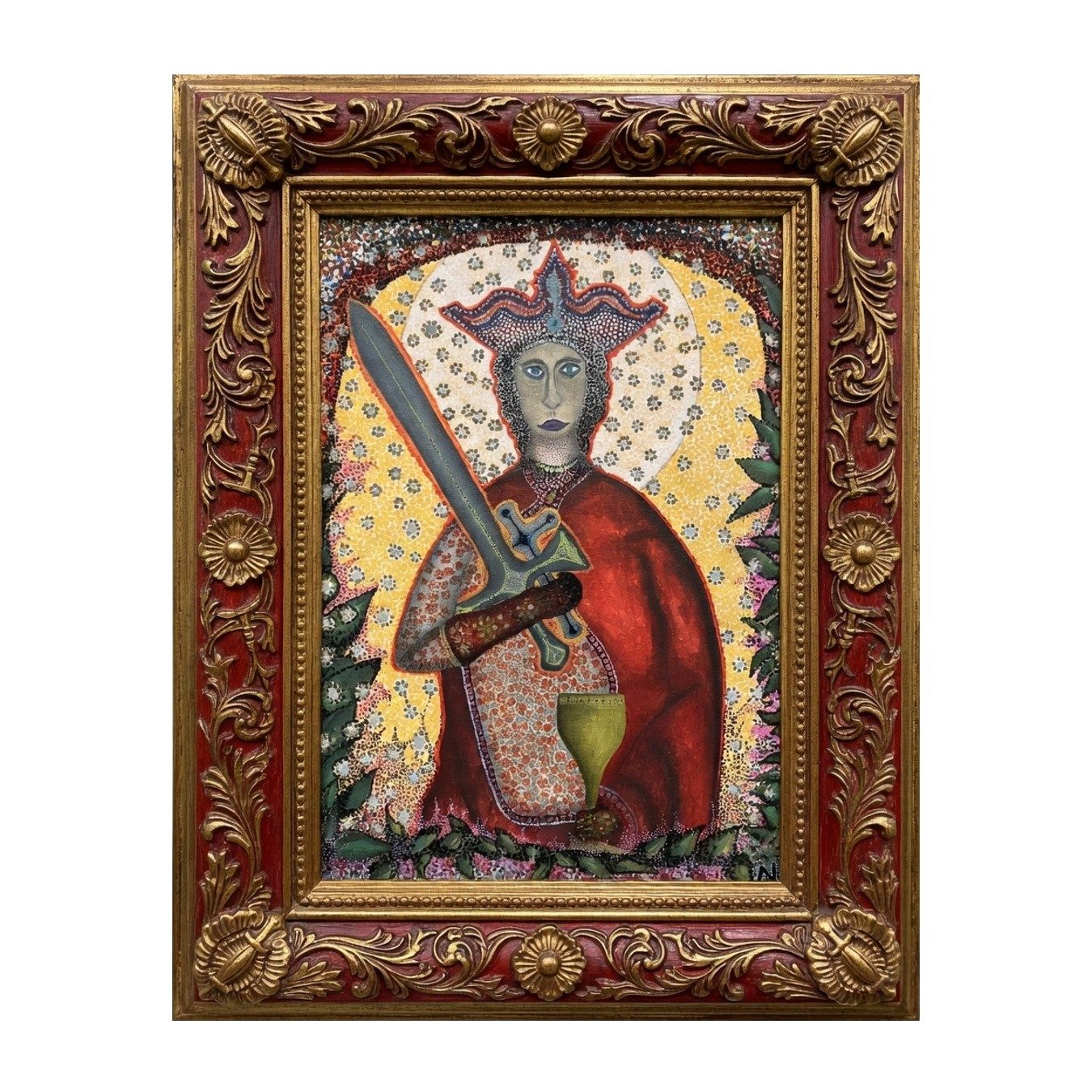Saint Barbara holds three powerful symbols in her hands, each telling a story of her faith and martyrdom. In one hand, she grips a gleaming sword, a testament to her courage and the trials she endured. The sword signifies both her strength and the divine justice she upheld; she also clasps a cross, the universal emblem of Christian faith and sacrifice, underscoring her unwavering devotion and spiritual resilience. In another hand, she holds a golden cup, symbolizing the chalice of salvation and the eternal reward promised to the faithful.